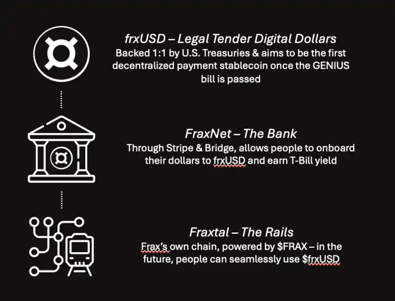除了潜在的监管先机外,FRAX 正在构建一个垂直整合的稳定币生态系统,包括 frxUSD(稳定币)、FraxNet(银行接口)和 Fraxtal(L2 执行层),以适应未来监管环境的需求: