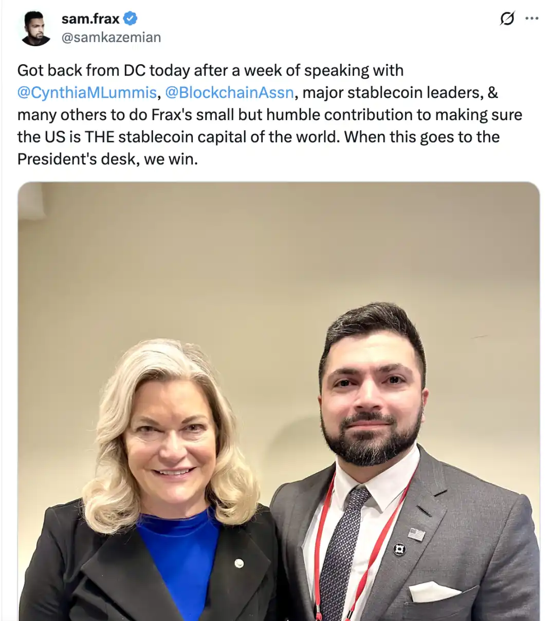 Frax Finance 的创始人 Sam Kazemian 自今年初以来频繁晒出自己在美国首都华盛顿与加密立法人物的合照。据传他作为业内人士深度参与了《GENIUS 法案》的讨论与起草。市场似乎正在为 Frax Finance 将据此拥有监管优势定价。