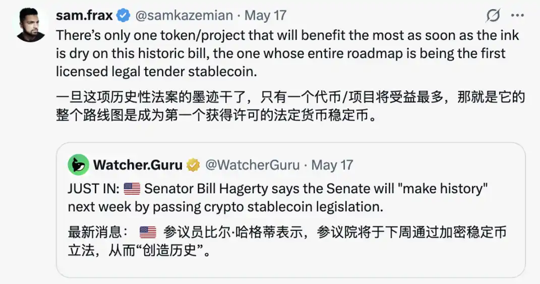 Frax 创始人 Sam 暗示 Frax 在该法案中受益最多