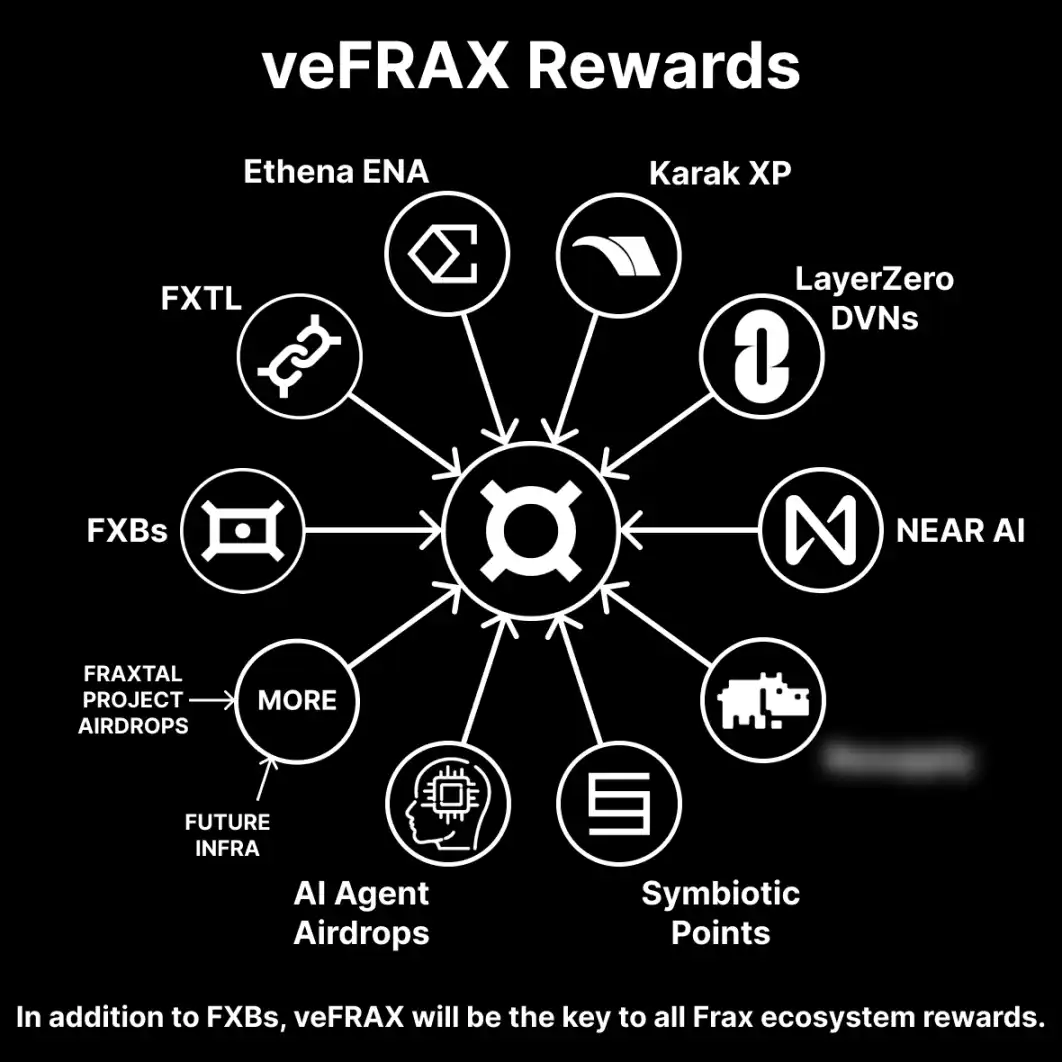 而质押 FRAX 为 veFRAX 能得到 FXTL(Frax 自身积分)、Karak、Ethena、Symbiotic 的积分等潜在奖励。