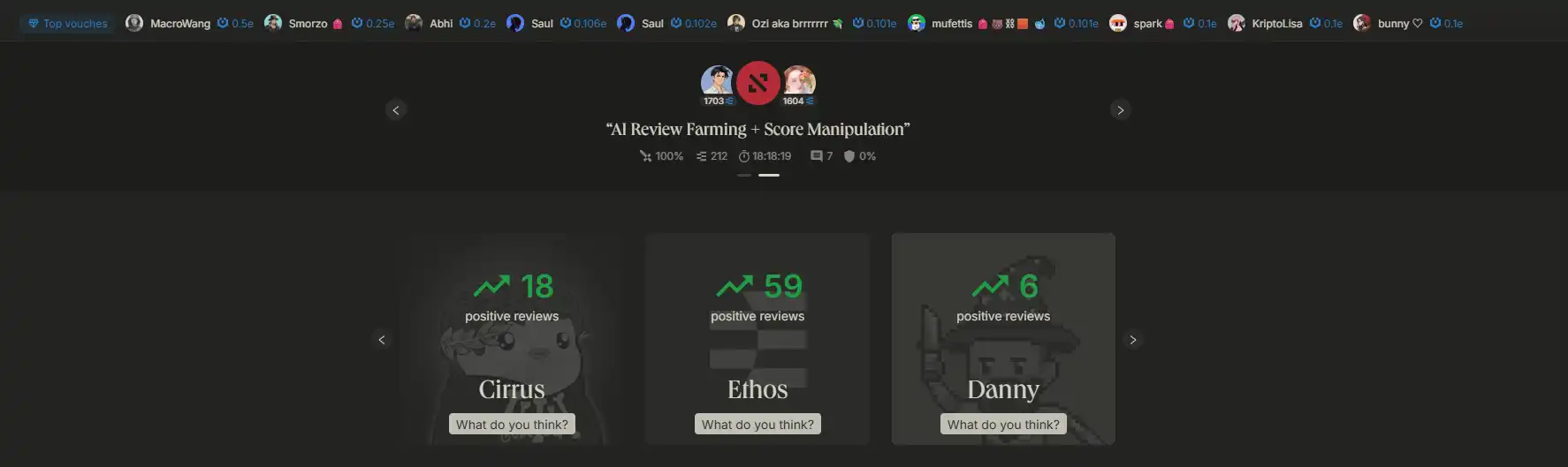 Ethos 比较像币圈版的「大众点评」,用户可以在这个链上声誉网络对项目方或是币圈的个体玩家进行好评或差评。在未来,这可能会成为项目方筛选合作对象的另一个方式。