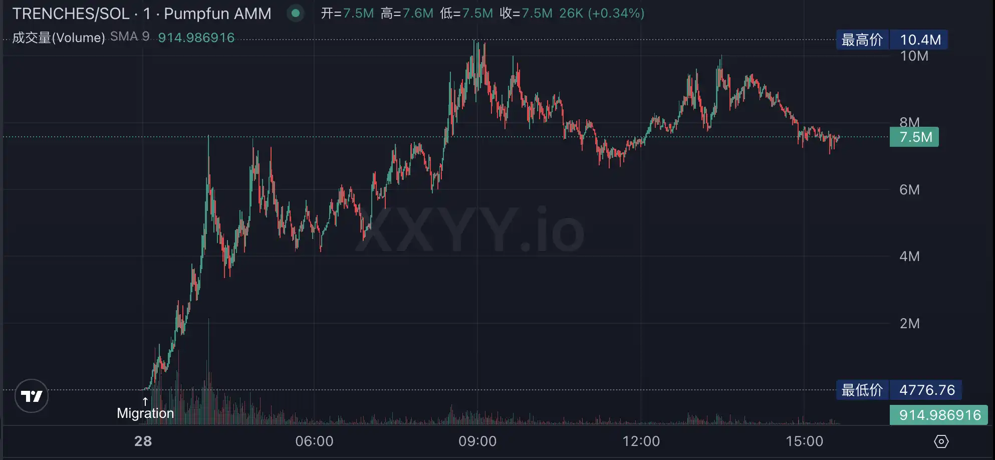 今日凌晨,一个名叫「Trenches」的代币进入市场的视野中,在 Pumpfun 内盘沉寂了 9 天之后,在今天成功「发射」并,并在 2 个小时内突破 700 万美元市值,随后一路突破 1000 万美元市值,现报价 750 万美元市值。「Trenches」在 Solana 社区早已不是新鲜概念,随着这个 Native 的词汇在 Degen 中越来越流行,「战壕」所代表的文化也深入人心。那这个「新战壕」又有什么不一样呢?