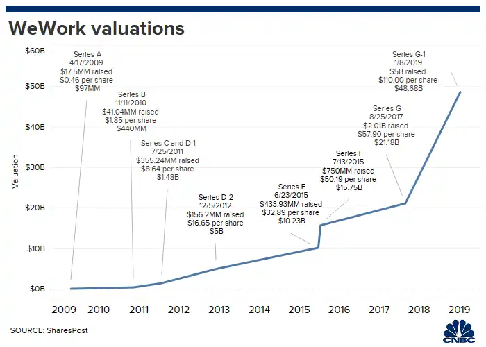当 WeWork 分别于 2018 年 11 月(30 亿美元)和 2019 年 1 月(20 亿美元)获得软银的投资时,其估值从 200 亿美元飙升至 470 亿美元。也就是说,软银的投资使 WeWork 的估值比之前高出了 270 亿美元。甚至 2018 年 200 亿美元的起点也是由软银设定的,软银在 2017 年的 G 轮融资中联合其 1000 亿美元的愿景基金投资了 44 亿美元。软银首席执行官孙正义在 WeWork IPO 撤回后曾表示,他对该公司的投资是「愚蠢的」,并对 WeWork 的估值仅为 29 亿美元。