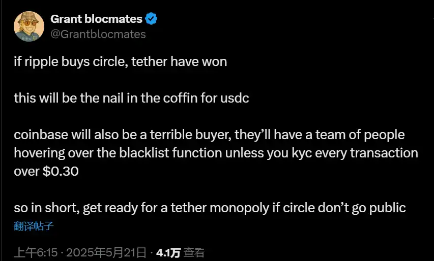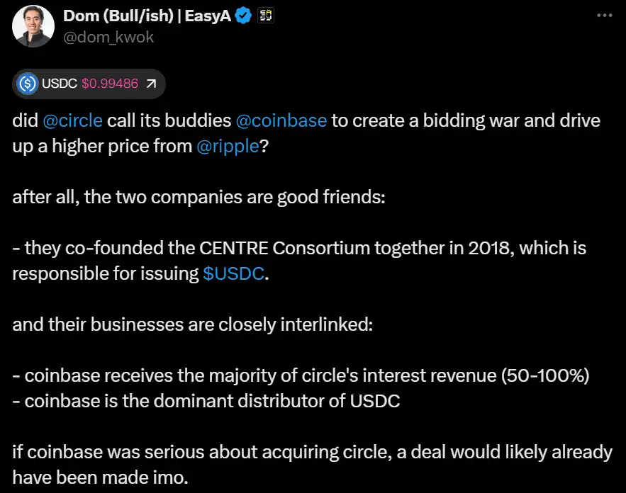 前 Coinbase 成员、现 vectordao 成员 @yiryan 也在 X 上分享了自己的观点,他认为,Coinbase 应该收购 Circle,也很可能会这么做。USDC 是 Coinbase 第二大收入来源,但因和 Circle 合作,收益归属受限。Circle 控制协议层,专注扩大整体市值,Coinbase 则想将 USDC 完全收入囊中,实现收入归一与协议控制。若收购 Circle,Coinbase 可获得完整收益、产品协同与监管优势。长期来看,收购是合理且必要的战略选择,关键只在价格。