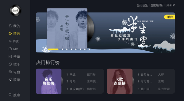 想了解道网易云音乐电视播放的小伙伴,一定需要一款实用的电视端音乐软件。有一款值得力荐的当贝酷狗音乐拥有4000多万海量曲库及90%以上的版权合作,亦或是华语、韩语、英语、日语歌曲都有。