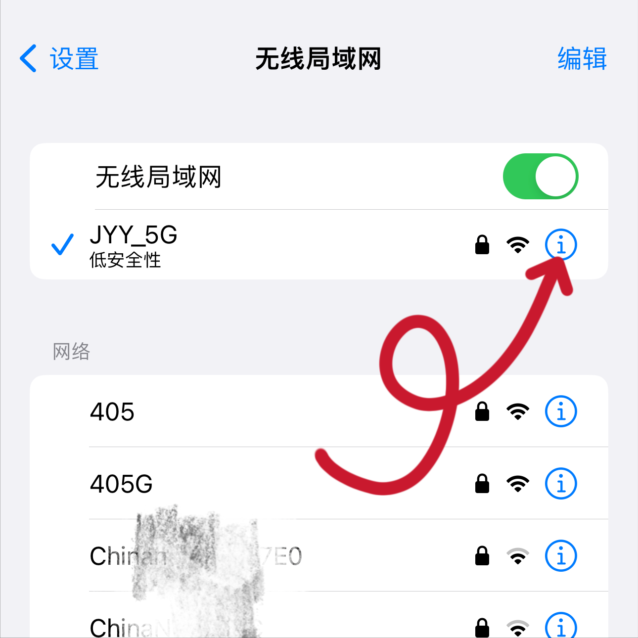 3.当前所连接的热点一栏后面有一个小圆圈里面一个蓝色的小感叹号?点击它
