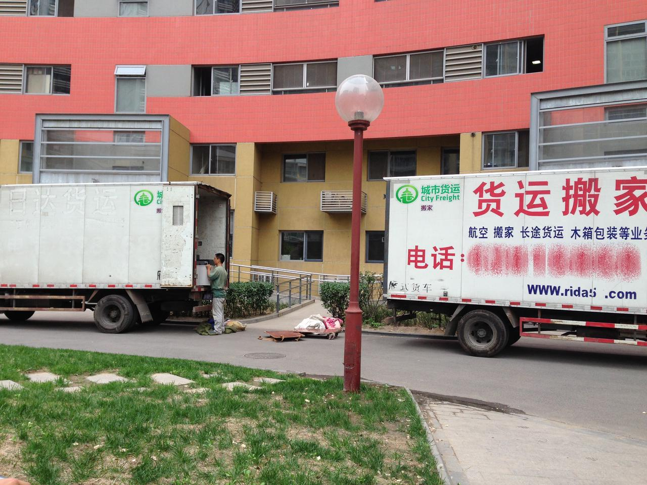 从上至下:团队搬离锦秋家园前的大合照; 搬家货车;刚刚搬进盈都