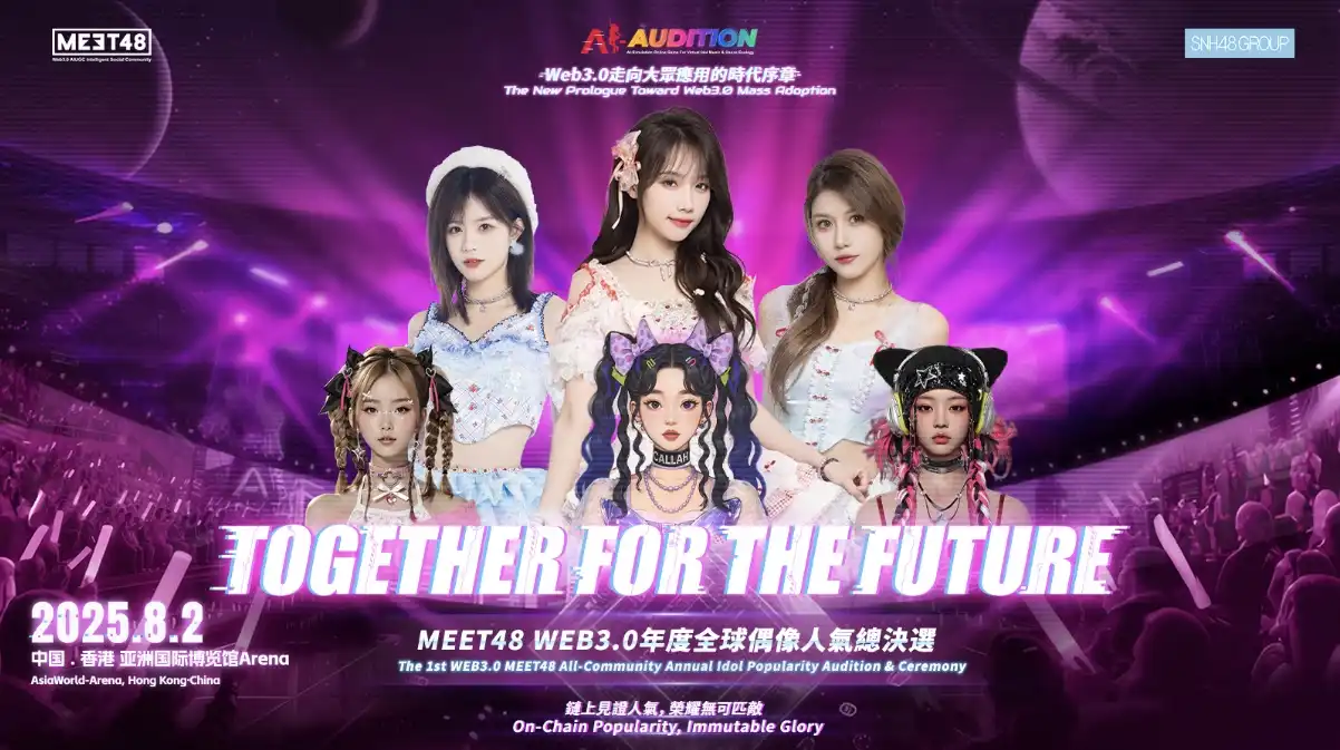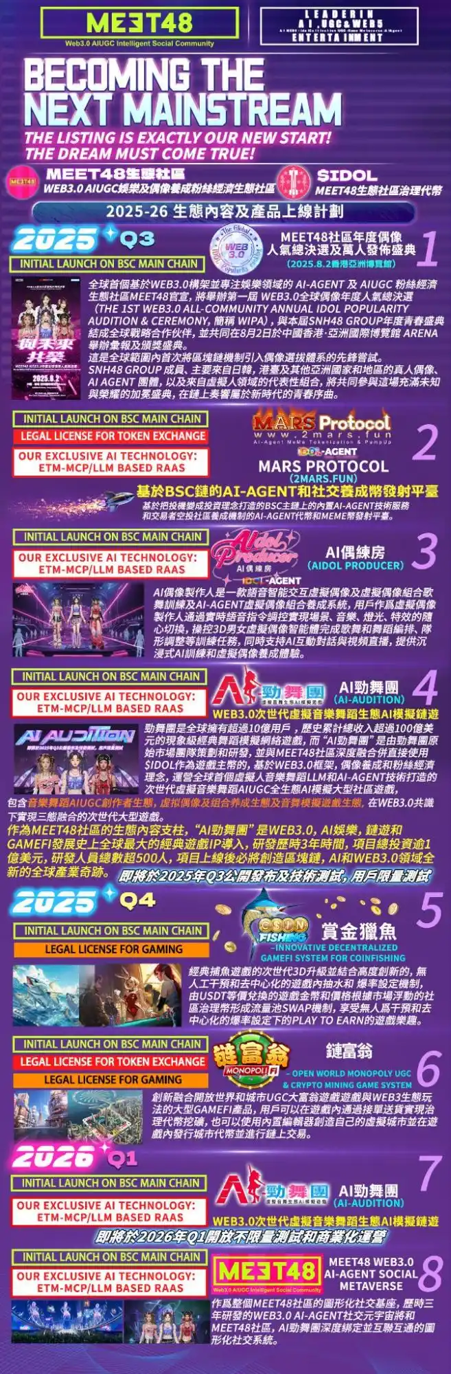 在 2026 年 Q1,Web3 次时代虚拟音乐舞蹈生态 AI-Audition(AI 劲舞团)将开启不限量测试和商业化运营。MEET48 还将重点构建去中心化 AI-Agent 图形社交基座和 MEET48 元宇宙。凭借 UGC 内容创作和人气养成配套代币价值成长的理念,MEET48 会携手用户共建强大的 Web3 AI 驱动型娱乐基础设施,共同引领偶像养成与粉丝经济的未来。