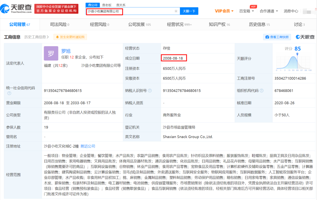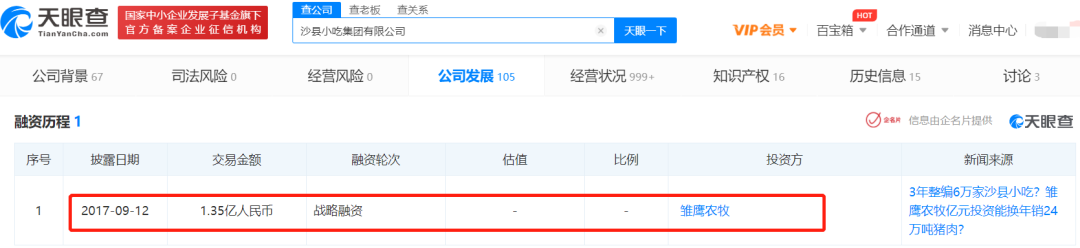天眼查信息显示,沙县小吃集团有限公司于2008年8月成立,2017年9月,沙县小吃还获得了雏鹰农牧1.35亿元的战略融资。