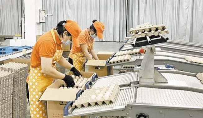 沙县小吃产业园内,员工正在给筛选好的鸡蛋装箱