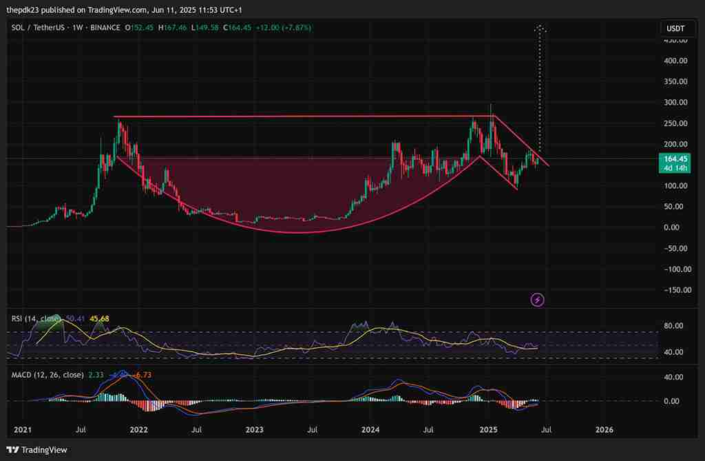 关注 Solana 美元价格的交易员们注意到,一些重要的技术信号正在形成。市场图表分析师指出,一个经典的“杯柄”形态正在形成。其含义如下:经过数月的盘整(“杯”位于 150 美元至 180 美元之间),随后出现短暂的回调(“柄”)。如果 Solana 价格随后强势突破 180 美元,历史经验表明,未来可能出现大幅反弹。