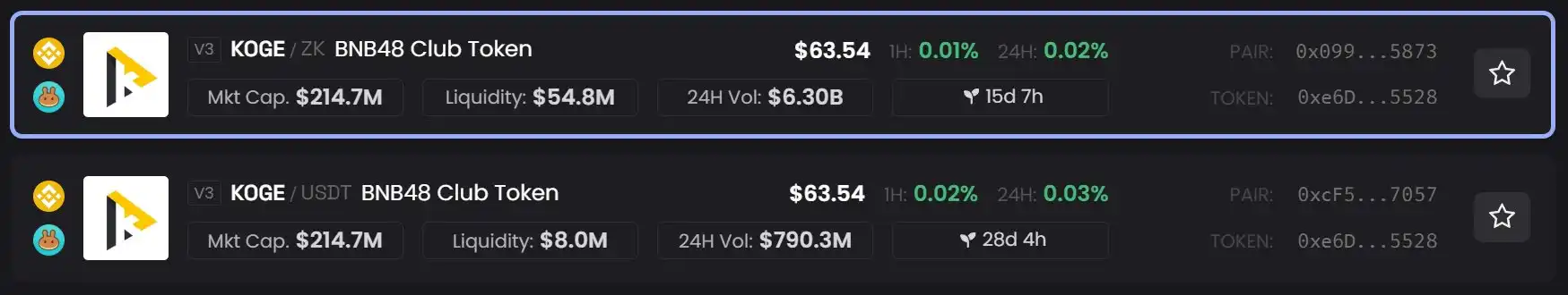 此前,项目方构建了 KOGE/ZKJ 的双币交易对,并向外部流动性工作室敞开权限,大规模引导资金参与刷量行为。与此同时,$KOGE 在 BNB 和 USDT 池中的流动性始终较浅,这意味着即便有大资金想退出,也难以直接将 KOGE 变现为主流资产。