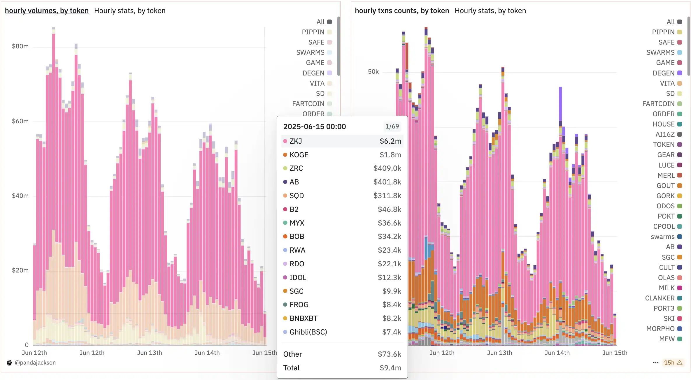 据 @pandajackson42 的数据面板显示,仅 6 月 14 日当日,Binance Alpha 总交易量达 9.87 亿美元,其中 ZKJ 与 KOGE 交易量分别为 7.03 亿与 1.59 亿美元,占据榜单前两位。