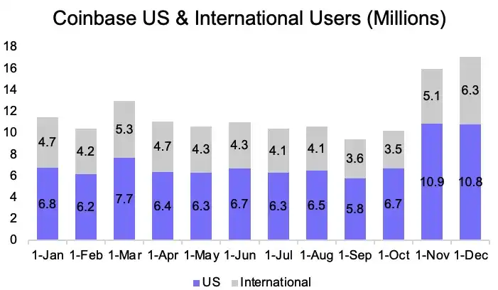 Coinbase 国内外活跃用户随时间的变化。来源:Data AI