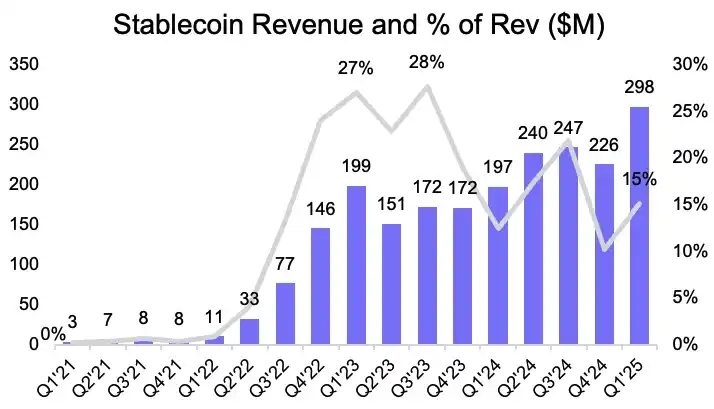 Coinbase 的稳定币收入及收入占比。资料来源:Coinbase 季度报告,Artemis