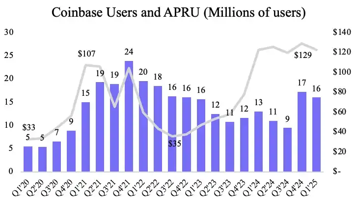 Coinbase 的用户增长保持相对稳定,ARPU(由抽成率 产品线增加驱动)则随着时间的推移而增长。资料来源:Coinbase 季度报告、Artemis、Data Ai