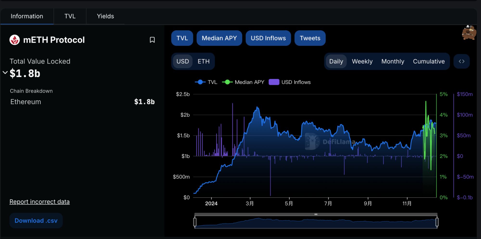 用户可通过质押 ETH 获得 mETH。DeFillama 数据显示,目前 mETH 上质押的 ETH 超过 46 万枚,TVL 已升至 18亿美元。