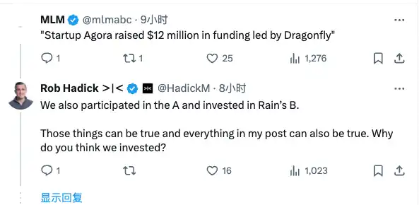 而 Moonpay 的总裁也在几个小时前宣布加入联盟,也许是为了回应社区领袖mlm在 Dragonfly 合伙人 Rob 为 Agora 发布的偏「FOMO」的言论推文,还特别宣布将要求 Paradigm 联创 Matt Huang 回避这次投票(Paradigm 同时是 Stripe、Tempo、MoonPay 和 Agora Finance 的投资者)。