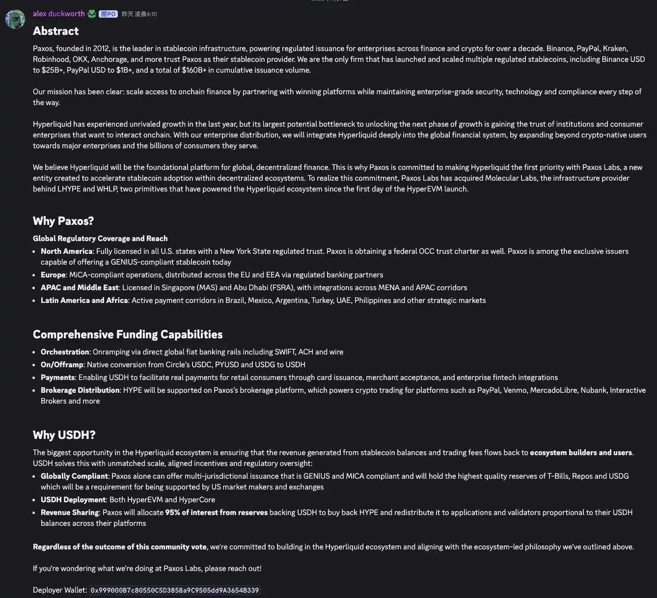 总体而言,Paxos 方案以合规可信为基础,辅以巨额回购和广阔渠道资源,被评价为「诚意十足」,既照顾法律合规和初期流动性接入,又直接为 HYPE 赋能,甚至打通法币和传统金融合作空间。