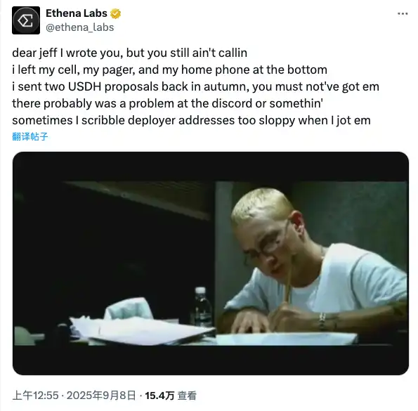 其推特的「Intern」在竞标消息公布后,Ethena 官推甚至发帖用艾米纳姆的 STAN 的 Meme 式推文「喊话」Hyperliquid 创始人 Jeff,抱怨自己提交的方案似乎石沉大海(Stan 歌曲大意是艾米纳姆的一位粉丝因为长时间没有收到偶像的回复最后选择带着妻儿自杀)。