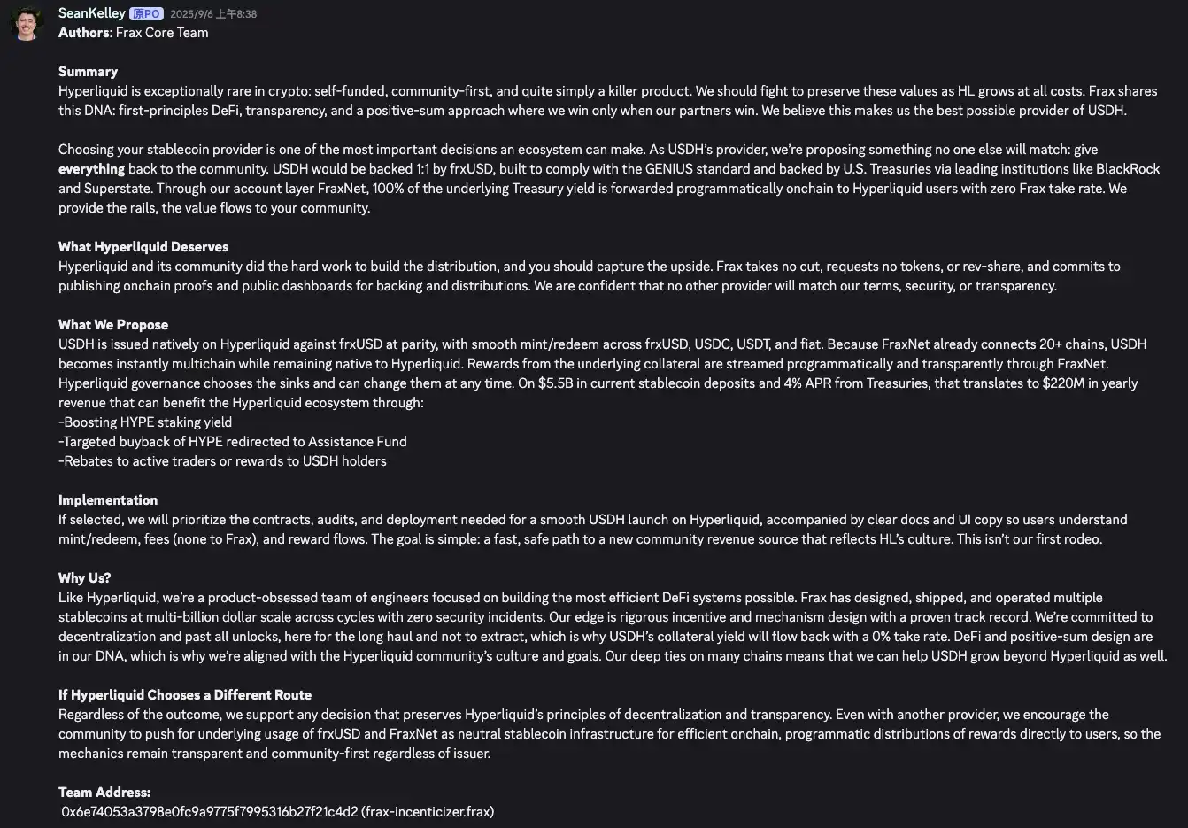 去中心化美元稳定币协议 Frax Finance 也火速跟进提交了方案。Frax 的提案主打「极致让利」和链上治理,承诺将 USDH 的底层收益 100% 返还给 Hyperliquid 社区。