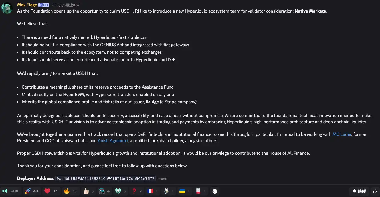 Native Markets 的提案是由此前牵头促成 Hyperliuquid DAT 上市公司 Hyperion 的社区领袖 Max 提出的,同时他也是所有提案中引发最多社区成员讨论的。