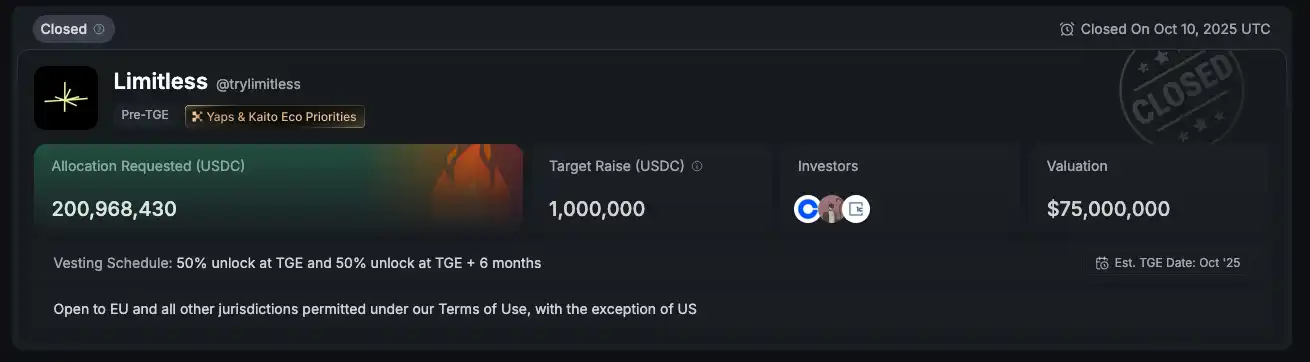 Limitless 已经公布即将发行平台代币 $LMTS,虽然此前遭受过项目方「刷」交易量的质疑,但其资深的投资方依然让市场对其相当热情,国庆期间在 kaito 的预售依旧超募了 200 倍。而第一季作为空投发放依据的积分活动已经结束,目前积分计划已进入第二赛季(2025 年 9 月 22 日开始,持续至 2026 年 1 月 26 日)。在此期间,用户依旧可以通过交易、提供流动性、邀请新人等操作赚取积分。