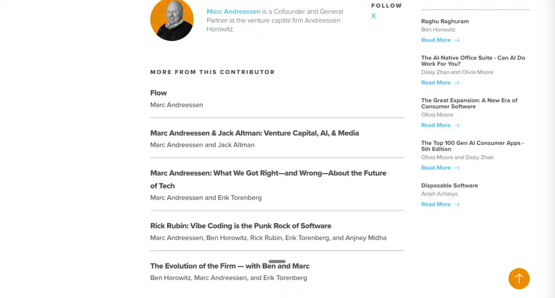 从 2011 年的《Why Software Is Eating the World》,到 2020 年的《It's Time to Build》,再到 2023 年的《Why AI Will Save the World》和《The Techno-Optimist Manifesto》,Marc 几乎每一篇文章都能引发全行业讨论。
