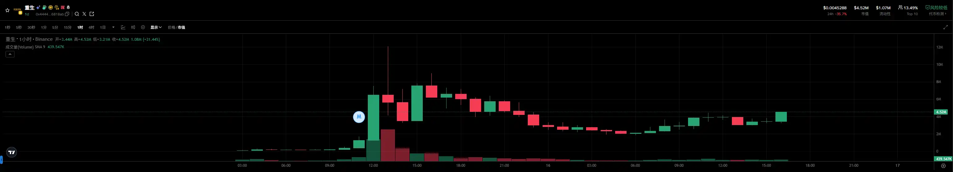 最先聚集起玩家们的共识并跑出来的「重生」币,是合约地址以「4444」为结尾的。从下面的 K 线图可以看到,从成功发射出来后,合约以「4444」为结尾的「重生」币就开始了上涨,最高市值一度突破 1500 万美元。