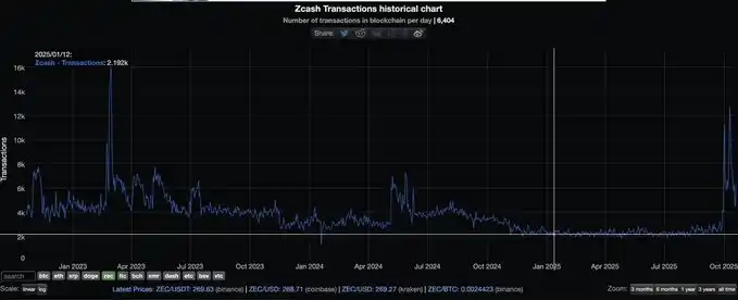 Zcash 的日交易量其实很低(每天 5–10k 笔),但它当前的「隐私」叙事非常强,因此获得了大量关注。而这种关注也可能反过来推动其可用性(参考近期交易量激增)。