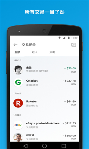 4、收支情况,明明白白每当您使用PayPal付款、收款和消费时,我们的应用程序都会给您发送推送通知,帮助您及时了解账户动态。通过PayPal付款时,无论您使用的是PayPal余额、银行账户还是借记卡和信用卡,您都能在这款安全的应用程序中找到所需的一切来轻松管理您的交易。