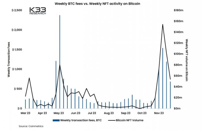 首先,Ordinals协议的出现为比特币矿工提供了额外的交易费用,而这在今年三月、五月和十一月三次激增的交易费用中得到体现,正好对应Ordinals协议今年的三波浪潮。根据研究机构K33的估算,2023年矿工每日收入为973个BTC,高于原本预计的每日900个BTC。Ordinals带来的额易费用使矿工的收入增长了约8%。