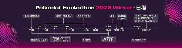 Parity和OneBlock联合举办的2023冬季波卡黑客松大赛已经于11月初开始报名,将于12月22日截止活动报名&代码提交。目前,workshop和office hour已经举行完毕,正在处于coding阶段。如果你希望挑战Web3创新,仍然有时间继续参与!查看时间节点、奖金池分配、评分指南、报名流程等关键信息:https://github.com/parity-asia/hackathon-2023-winter