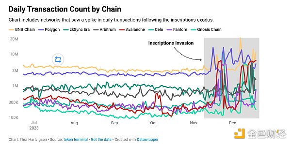 不出所料,除了少数网络(Arbitrum 和 TON)因不堪重负完全宕机需要喘口气之外,其他链条都扛住了铭文风暴的洗礼。