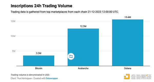 比特币之外,铭文应用的盛行程度令人震惊。以交易量计,Solana 和 Avalanche 等链完全接管了市场。