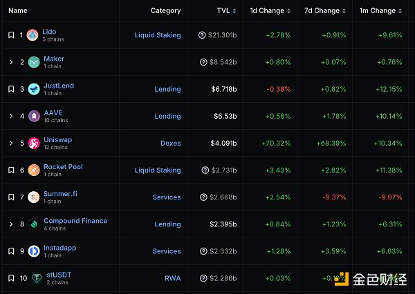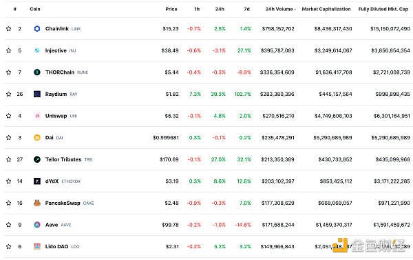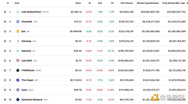 DeFi总市值及前十代币 数据来源:coingecko