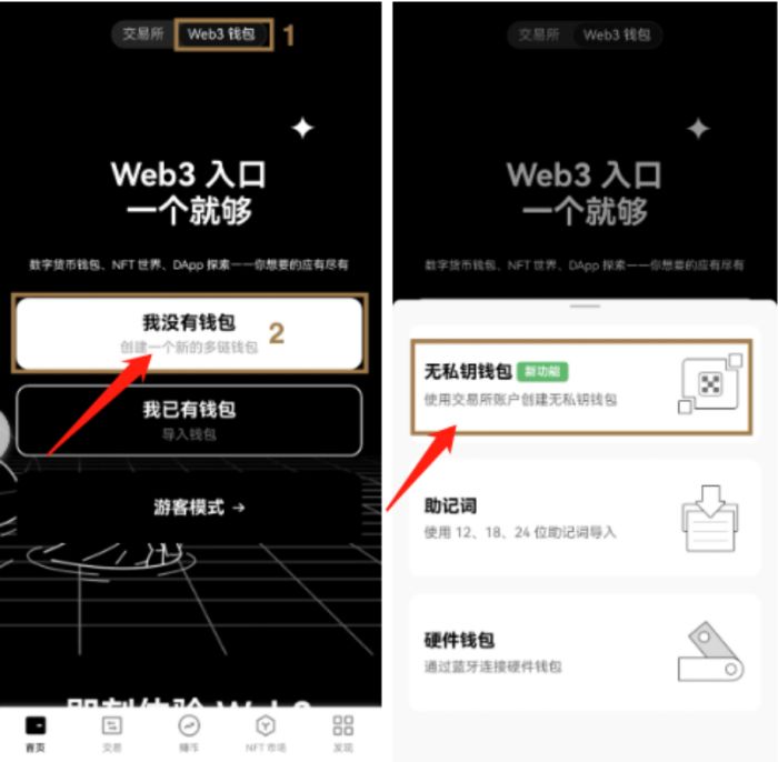 2、接着打开 OKX App,主页切换至 Web3 钱包,选择我没有钱包 > 无私钥钱包。