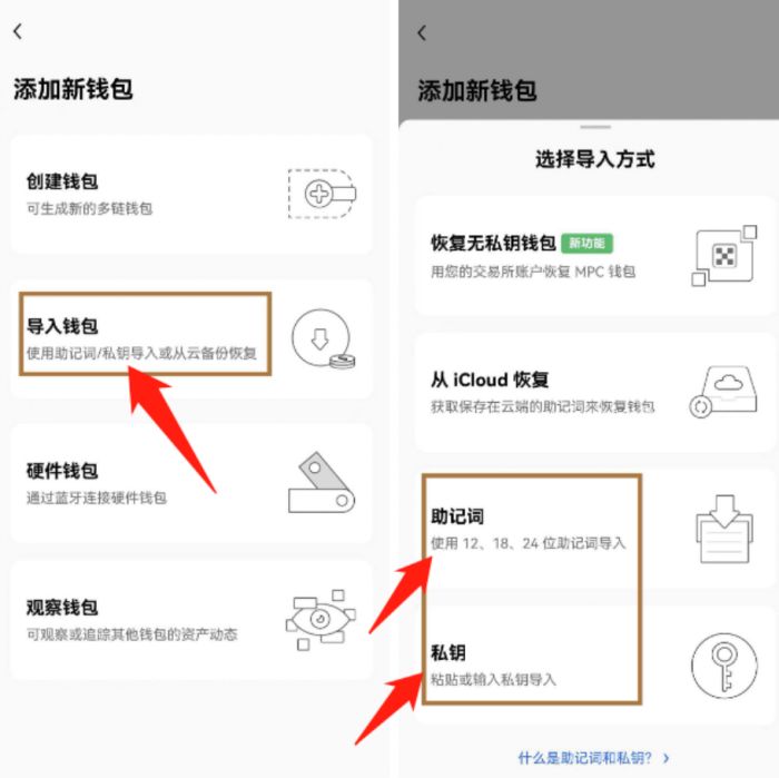 2、选择导入钱包 > 助记词或私钥,完成导入。