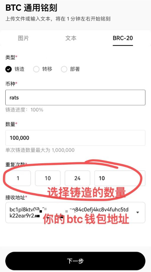 3、选择铸造数量,确定钱包地址是否正确,然后点下一步。