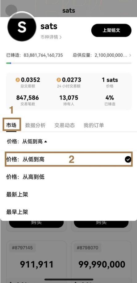 1、在 Ordinals 市场中 BRC-20 列表中选择对应的 BRC-20.我们以sats为例。