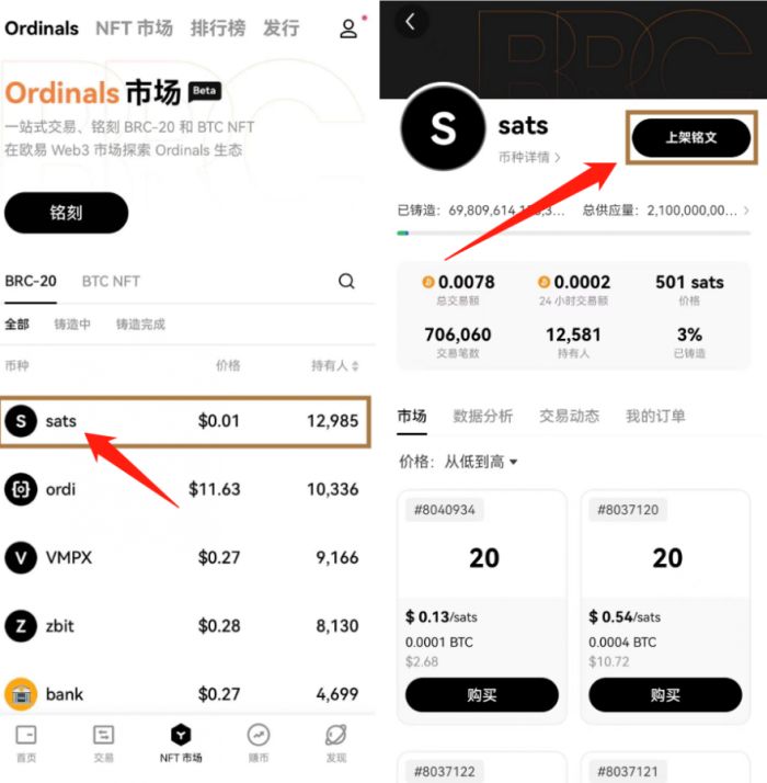 1.教程以sats为例示范,rats也是同样的操作,首先在 Ordinals 市场中 BRC-20 列表中选择对应的 BRC20.点击详情页,点击【上架铭文】