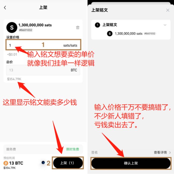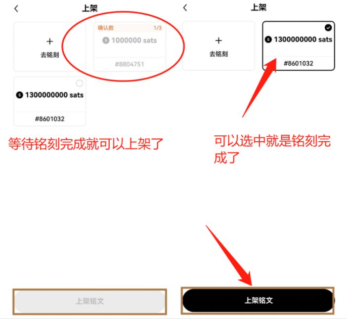 4.等待区块确认后,选择铭文,点击【上架铭文】,输入价格后,点击【上架】,【确认上架】即可。