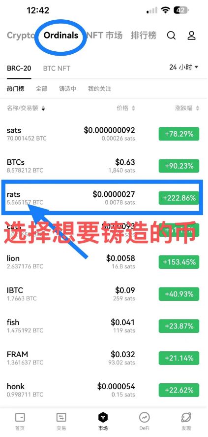 1、在Ordinals市场中 BRC-20 列表中选择想要铸造的 BRC-20.找不到的在右上角搜索。