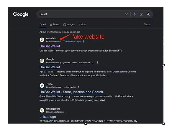 第一种方式在币圈太常见了。不仅是交易所,钱包都会给你搞个假冒的。骗子们也是很勤奋,什么热就搞个假冒的什么东西来套路你,比如打铭文比较热的Unisat,骗子就整一个虚假的网站,然后在百度或者谷歌进行搜索关键词的优化和推广,让不明真相的朋友在查询网站时点击访问或注册,当你注册为他们的用户后,就会出现你明明没有泄露助记词但资产却没了的神奇现象,因为你将其他账户内的虚拟资产提到应用内的钱包账户时,你钱包中的资产就被他们给盗走了。