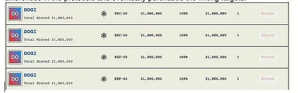 不仅交易所和钱包能够假冒,铭文本身也能假冒,我在某Web3钱包中搜索同样的字段,却能够看到很多同一个名称的铭文,比如在某网站上搜DOGI这一热度较高的铭文,能够找到四个看上去一模一样的结果,多少有点傻傻分不清楚。这是因为平台通常只抓取特定的字段在前展示,诈骗者利用此规则进行碰瓷或诈骗。