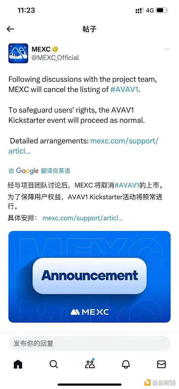 在AVAV社区的交涉后,MEXC交易所不敌众议,最终决定下架AVAV1并发布公告:“MEXC 将取消 Avavriptions (AVAV1) 上市,并向 Kickstarter 参与者提供补偿”。