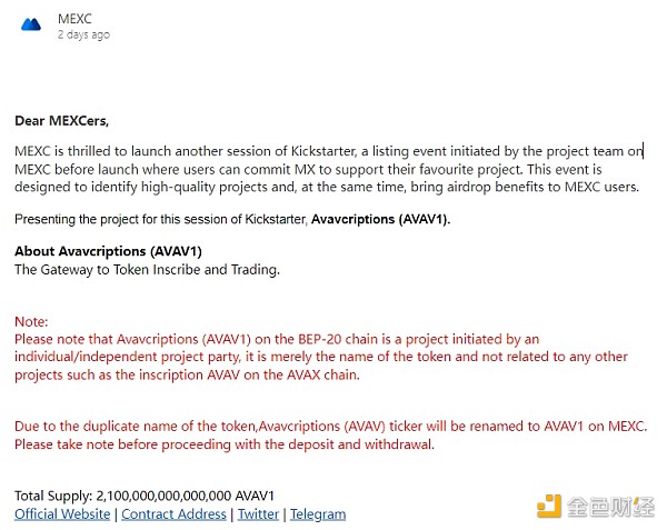 不明就里的投资者很容易将AVAV与AVAV1混淆,但这其实是交易所的“李逵与李鬼”戏码。在MEXC的公告中,有这样一条提示:“请注意,BEP-20 链上的 Avavcriptions (AVAV1) 是一个由个人/独立项目方发起的项目,它仅仅是代币的名称,与 AVAX 链上的铭文 AVAV 等任何其他项目无关。由于代币名称重复,Avacriptions (AVAV) 代码将在 MEXC 上重命名为 AVAV1。请在进行存款和取款之前注意。”