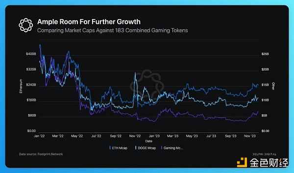1:2023年全年,183个游戏项目的总市值相对稳定在 40 亿至 70亿 美元之间,比2022年的历史高点低 86%。仍有巨大的增长潜力。