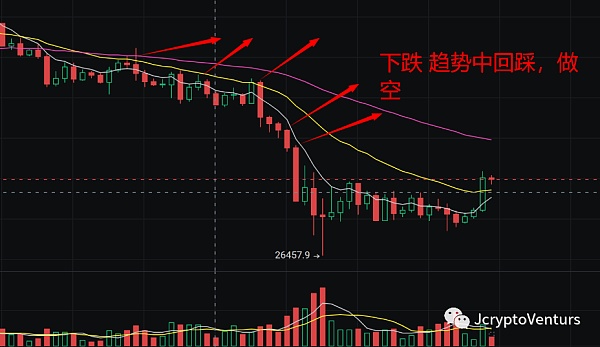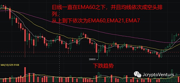 ②定趋势:首先判断大方向,未来的趋势是向上还是向下,在向上的情况下,会只选择关键点进场做多,在向下的情况下只会选择关键点进场做空,那么如何判断大方向呢?本人 ;是以日线的EMA60来确定未来大方向的,日K在EMA60之上上涨趋势,日K在EMA60之下下跌趋势。