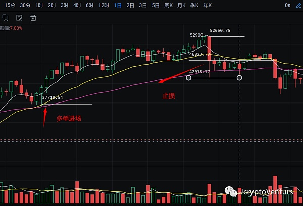 例:日线在EMA60之上,多头趋势,日线回踩EMA60 ; ,BTC37700多单进场,买入2BTC,当BTC价格达到52900时盈利30400美金,如果你的止损方式是以日线收盘价跌破EMA7来止损,那么当你平仓的时候盈利18246美金,而跌到10000美金,如果使用指标来止损是无法预测极端行情带来的亏损甚至爆仓,如果你使用移动止损收益回撤5%到10%来止损,那么止损价(51380—52100)盈利就是29380—27400,这样的好处就是防止利润回撤以及极端行情导致爆仓。